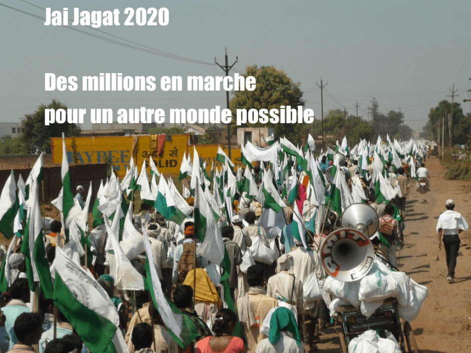 Jai Jagat veut dire : Victoire du Monde, en hindi. Cette mobilisation extraordinaire est à l’image des marches de paix de Gandhi. Elle a été lancée par Ekta Parishad (Forum de l’Unité, en hindi), dont s’occupe en particulier un homme rare : Raja Gopal. Depuis 1991, date de création de cette association, cet homme « aux pieds nus », soutien les villageois indiens, pour qu’ils obtiennent le respect de leurs droits dans leur pays. Tâche très difficile, d’autant que le gouvernement indien de Narendra Modi, s’il dit bien comprendre les problèmes des paysans sans terre, répète sans cesse qu’il a les mains liées par les accords de libre-échange provenant du Fonds monétaire international de la Banque Mondiale, des multinationales et des compagnies minières.